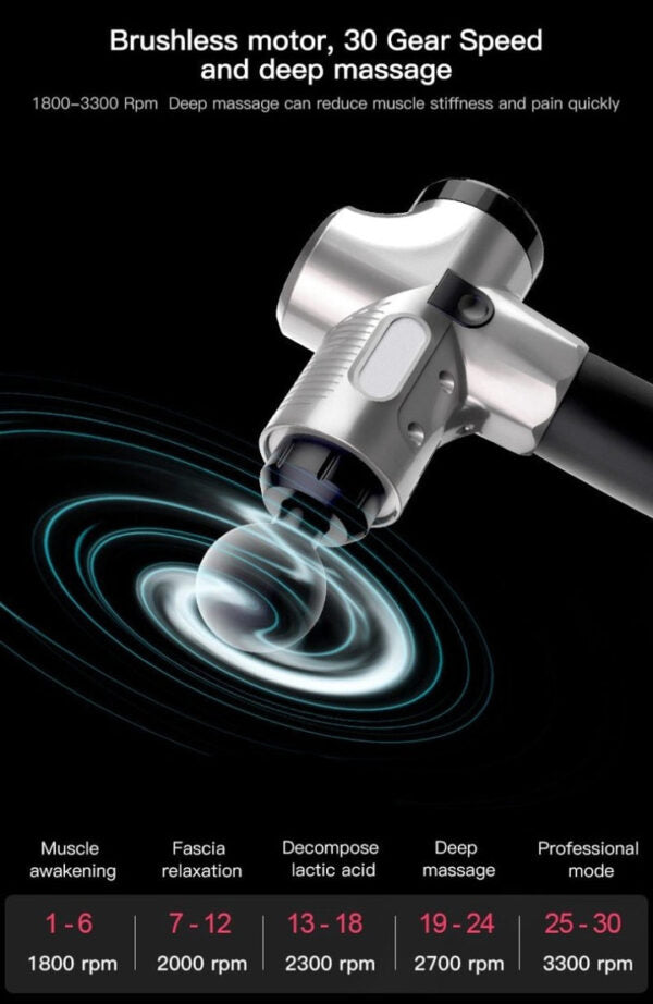 - POWERFUL & VERY QUIET: Enjoy your deep tissue massage gun and repair your muscles in a relaxing silence. This Massage Gun has a brushless motor for low noise. With 45 dB of the newest noise reduction technology and a high-torque motor, a professional deep tissue massager has 30 adjustable speed settings delivering up to 3,300 percussions per minute.